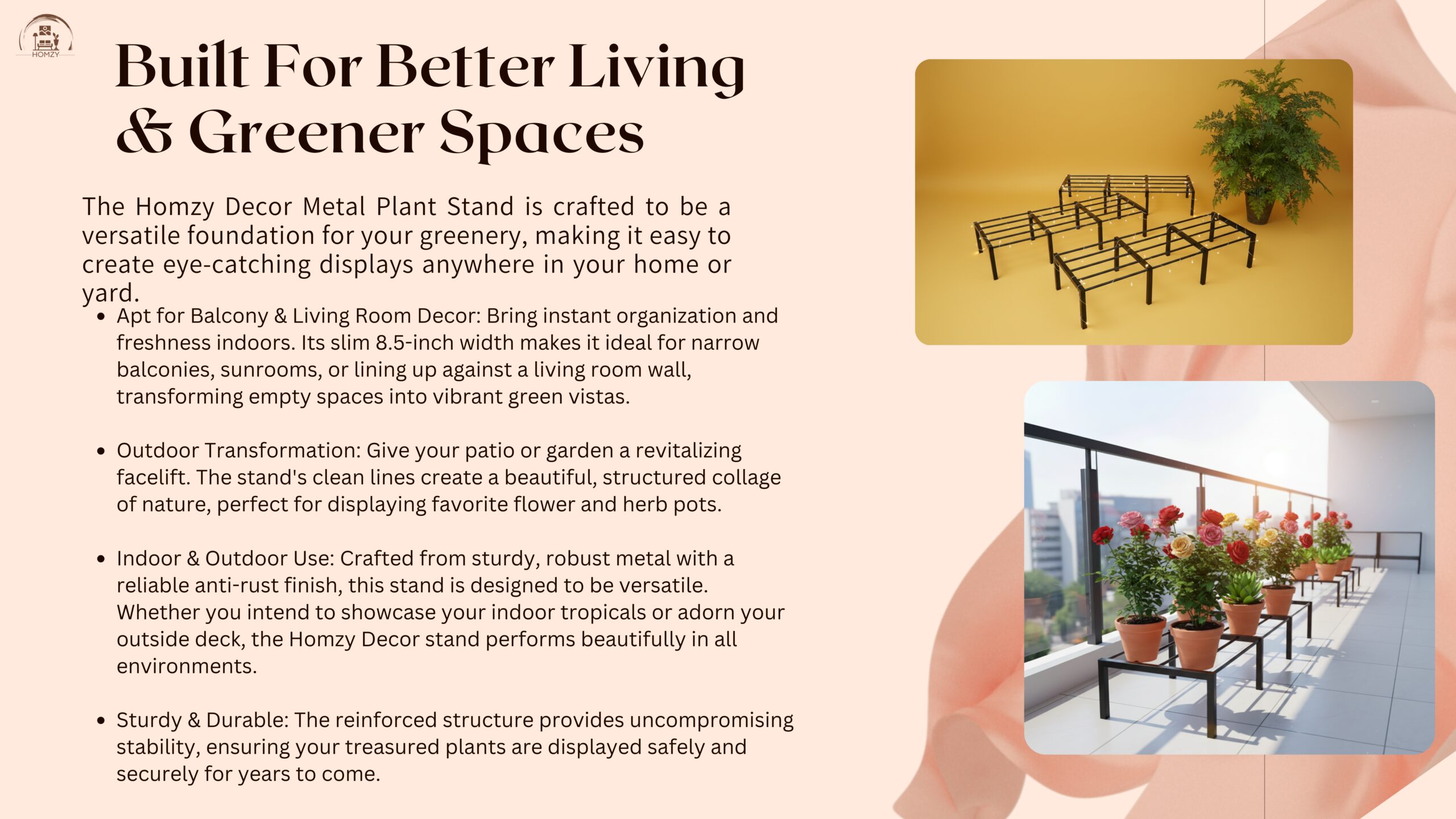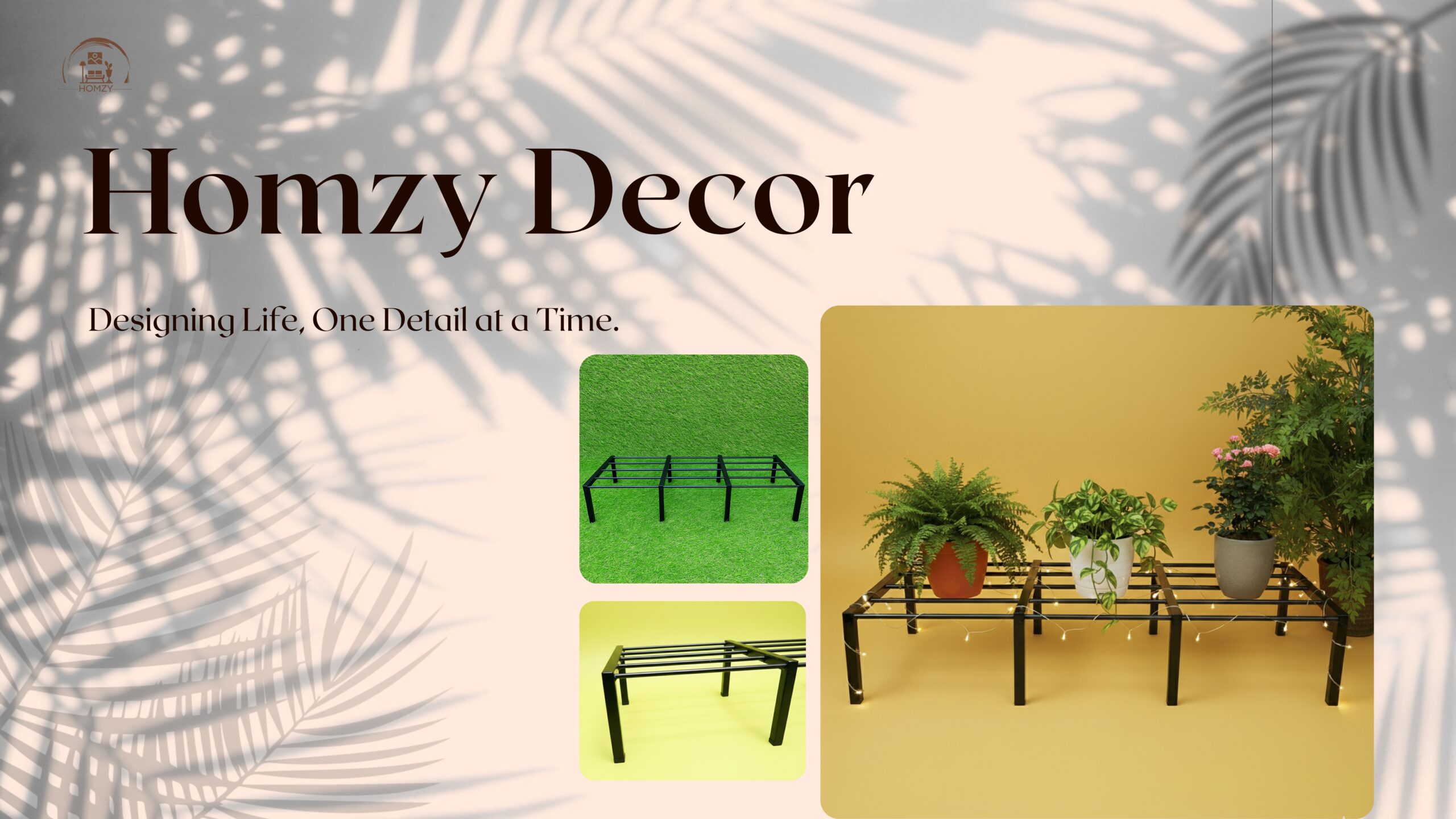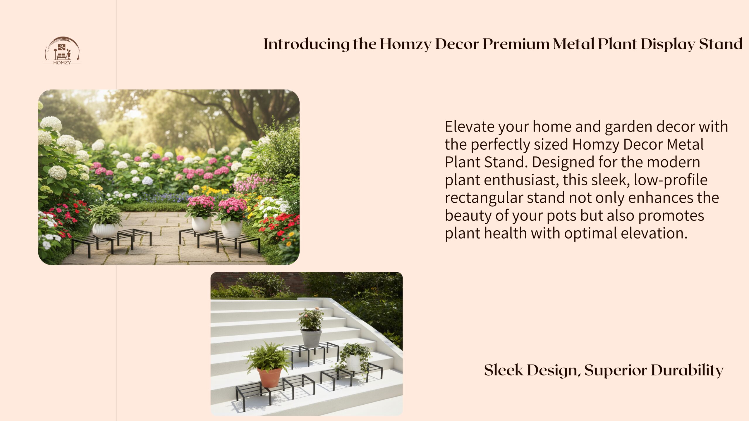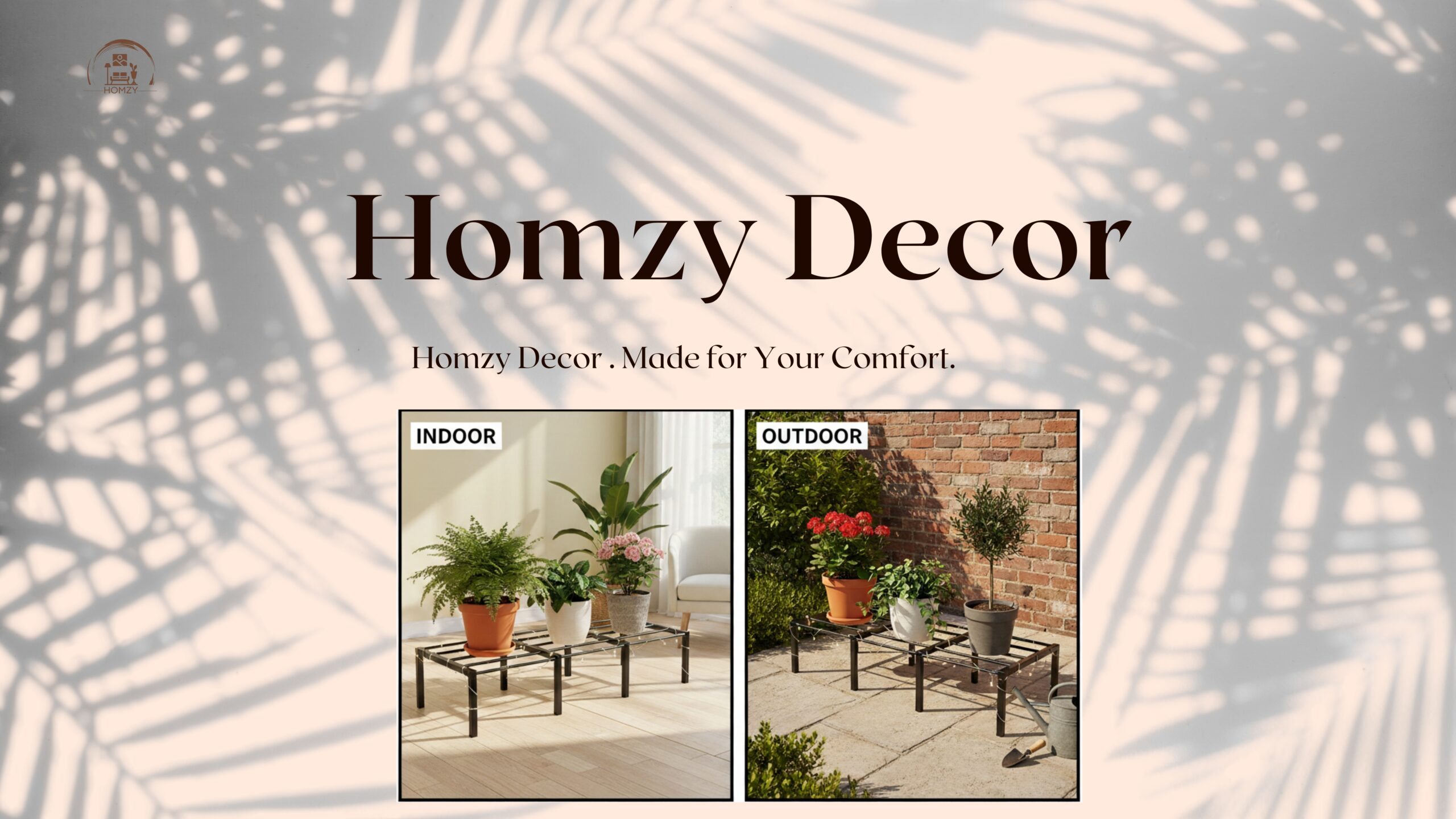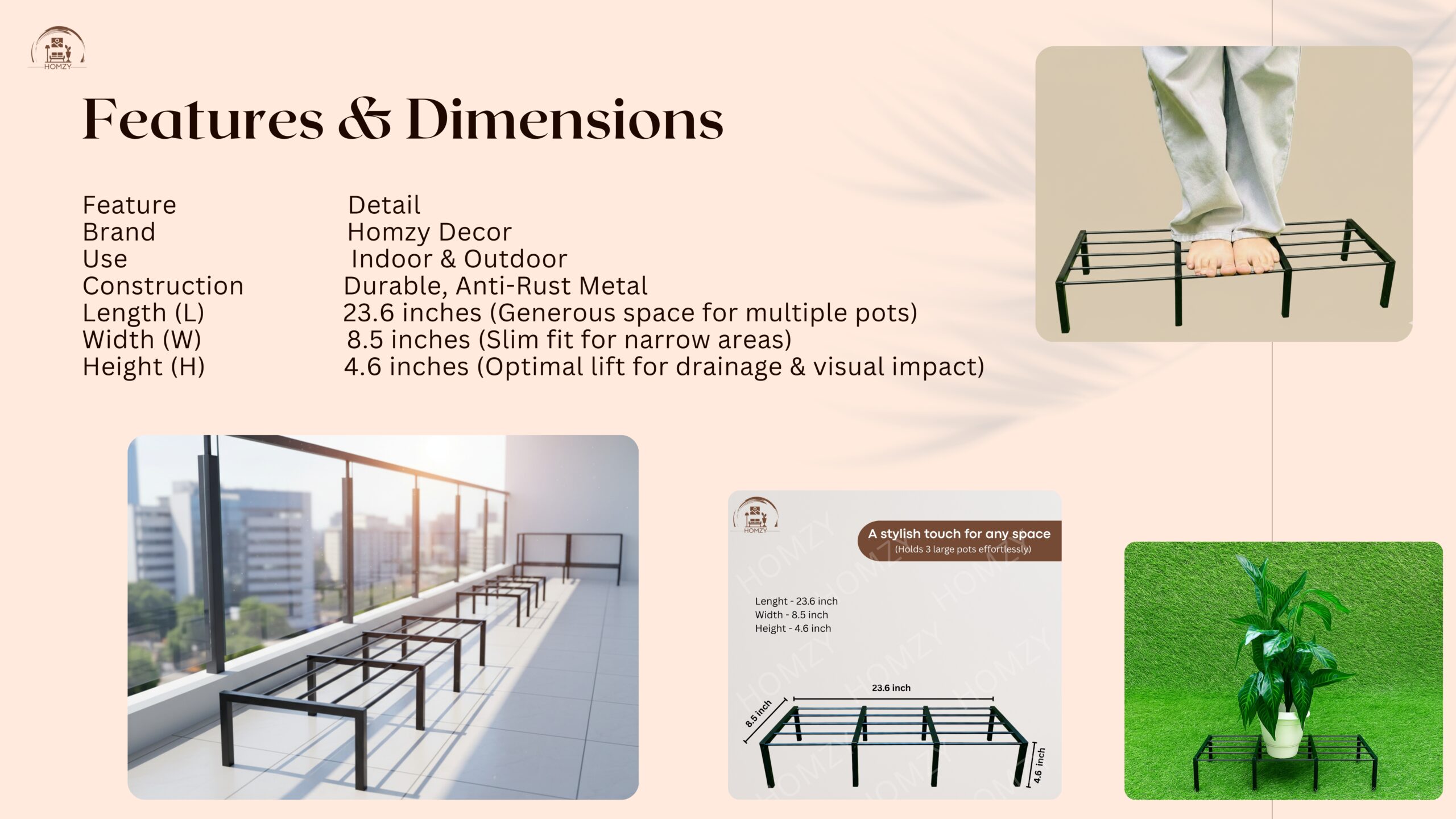 ✨ Introducing the Homzy Decor Premium Metal Plant Display Stand – Sleek Design, Superior Durability! Elevate your home and garden decor with the perfectly sized Homzy Metal Plant Stand. Designed for the modern plant enthusiast, this sleek, low-profile rectangular stand not only enhances the beauty of your pots but also promotes plant health with optimal elevation. 🌿 Built For Better Living & Greener Spaces The Homzy Decor Metal Plant Stand is crafted to be a versatile foundation for your greenery, making it easy to create eye-catching displays anywhere in your home or yard. Apt for Balcony & Living Room Decor: Bring instant organization and freshness indoors. Its slim 8.5-inch width makes it ideal for narrow balconies, sunrooms, or lining up against a living room wall, transforming empty spaces into vibrant green vistas. Outdoor Transformation: Give your patio or garden a revitalizing facelift. The stand’s clean lines create a beautiful, structured collage of nature, perfect for displaying favorite flower and herb pots. Indoor & Outdoor Use: Crafted from sturdy, robust metal with a reliable anti-rust finish, this stand is designed to be versatile. Whether you intend to showcase your indoor tropicals or adorn your outside deck, the Homzy stand performs beautifully in all environments. Sturdy & Durable: The reinforced structure provides uncompromising stability, ensuring your treasured plants are displayed safely and securely for years to come. 📐 Features & Dimensions Feature Detail Brand Homzy Decor Use Indoor & Outdoor Construction Durable, Anti-Rust Metal Length (L) 23.6 inches (Generous space for multiple pots) Width (W) 8.5 inches (Slim fit for narrow areas) Height (H) 4.6 inches (Optimal lift for drainage & visual impact) Export to Sheets What is in the box? 1 Premium Homzy Metal Plant Stand